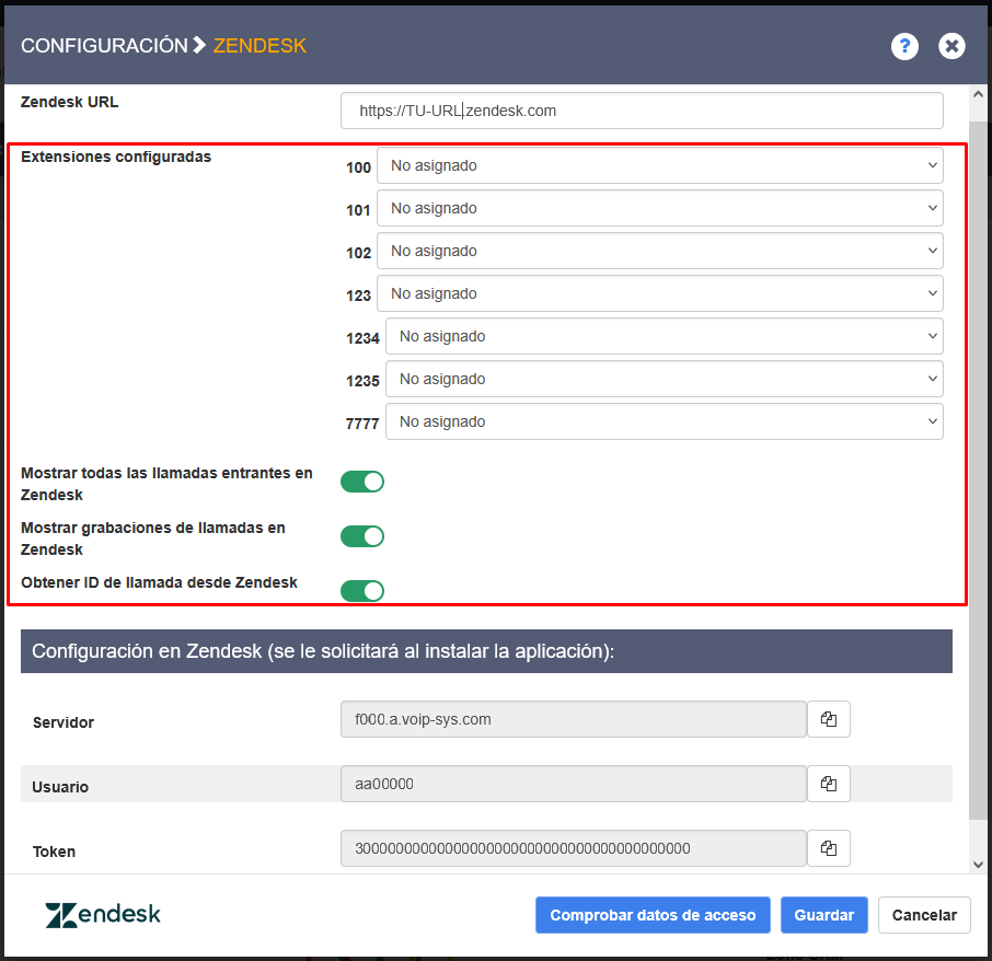 - Extensiones configuradas: asigne a cada extensión de su centralita a que usuario de Zendesk quiere asociarla. Las llamadas realizadas y recibidas desde esa extensión se asociarán a ese usuario de Zendesk.