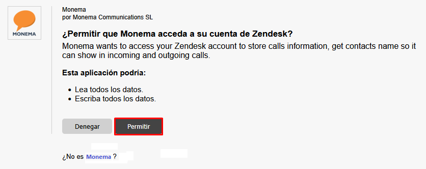 - Introduzca la URL y haga clic sobre el botón "Haga click aquí para autenticarse con Zendesk". Le llevará a una ventana en la que le solicitará permiso para permitir que Monema pueda acceder a los datos. Haga clic en "Permitir".