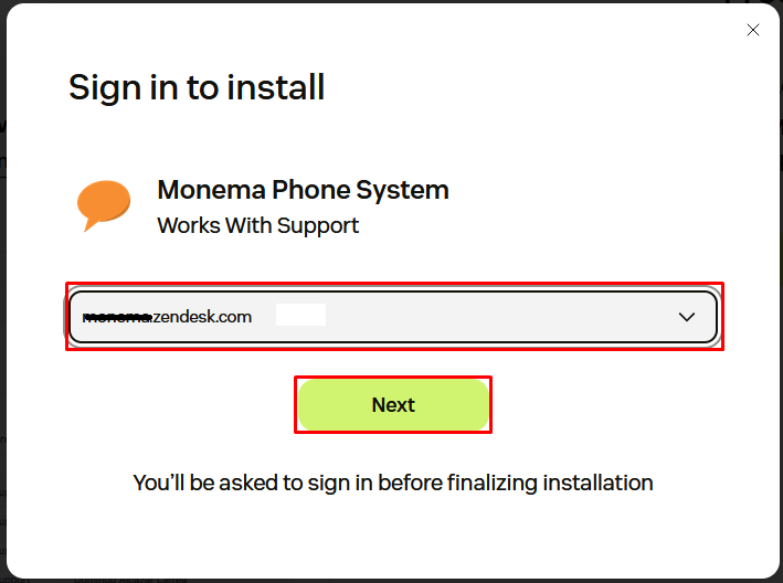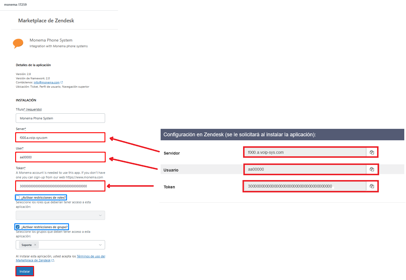 - Ahora aparecerá la configuración de la integración. Deberá rellenar los siguientes campos acorde a lo que está en el panel de control de Monema > Integraciones > Zendesk > Configurar > "Configuración en Zendesk". Finalmente haga clic en "Install".