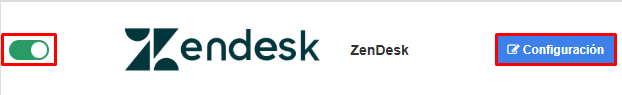 - Acceda al apartado "Integraciones" del panel de Monema, busque el módulo de Zendesk y haga clic en el botón de la izquierda. A continuación haga clic en "Configuración".